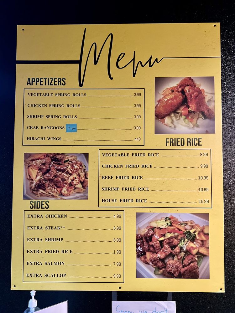 The menu features a variety of appetizers, such as traditional sweet crispy chicken wings, shrimp spring rolls, and homemade egg rolls filled with vegetables and protein options. The hibachi entrees include vegetable, chicken, steak, salmon, and shrimp options, all served with fried rice and cabbage, accompanied by two savory sauces.